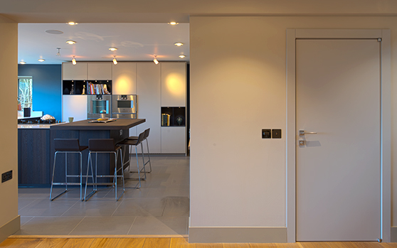 Of course, all of the internal doors worked well with the highly bespoke external front door, itself a stunning bespoke creation based on our Olivo SI design. Here, horizontal concrete panels are divided by narrow metallic strips – all beautifully proportioned. Meanwhile, a sleek steel handle runs the entire 2m height of the door – unusual and eye-catching in equal measure, yet still eminently appropriate in its context. A vertical glass panel allows light into the entranceway too.